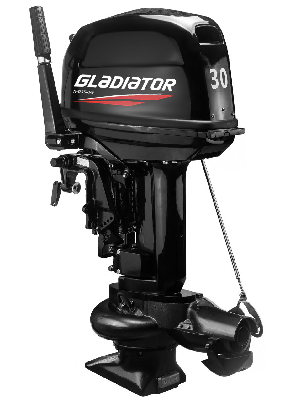 Gladiator G30FH (водомет) имеет 2 тактную конструкцию, что делает их надежными, а обслуживание и ремонт простым. Так же эти моторы имею невысокие требования к качеству топлива. Управление осуществляется с румпеля, есть три передачи (вперед, назад и нейтраль) для удобного маневрирования. Электронная система зажигания CDI гарантирует запуск в любых условиях.
