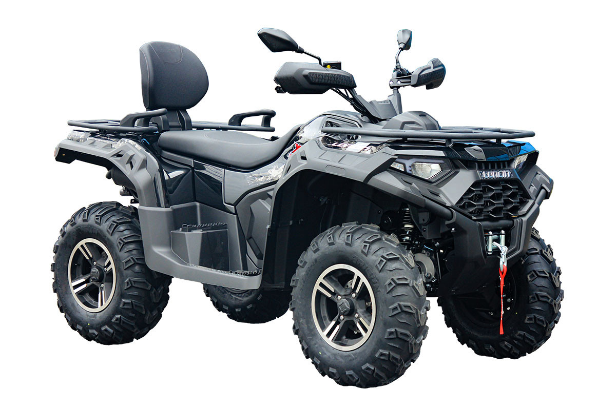 Мощный двигатель, полный привод, надежная рама, увеличенная колёсная база и сиденье для пассажира. XWolf 550L готов к любому маршруту – от расслабленной прогулки до дальней экспедиции по хардкорному бездорожью.Даже внешность XWolf 550L говорит – тут всё серьезно! Стильная решетка радиатора, как у моделей XWolf 700L и XWolf 1000, фары со светодиодными ходовыми огнями. Мощные бамперы. Два практичных багажника спереди и сзади. Легкосплавные колёсные диски и защита основных элементов из прочнейшего пластика. Наконец, красивая и информативная приборная панель с LCD-дисплеем.