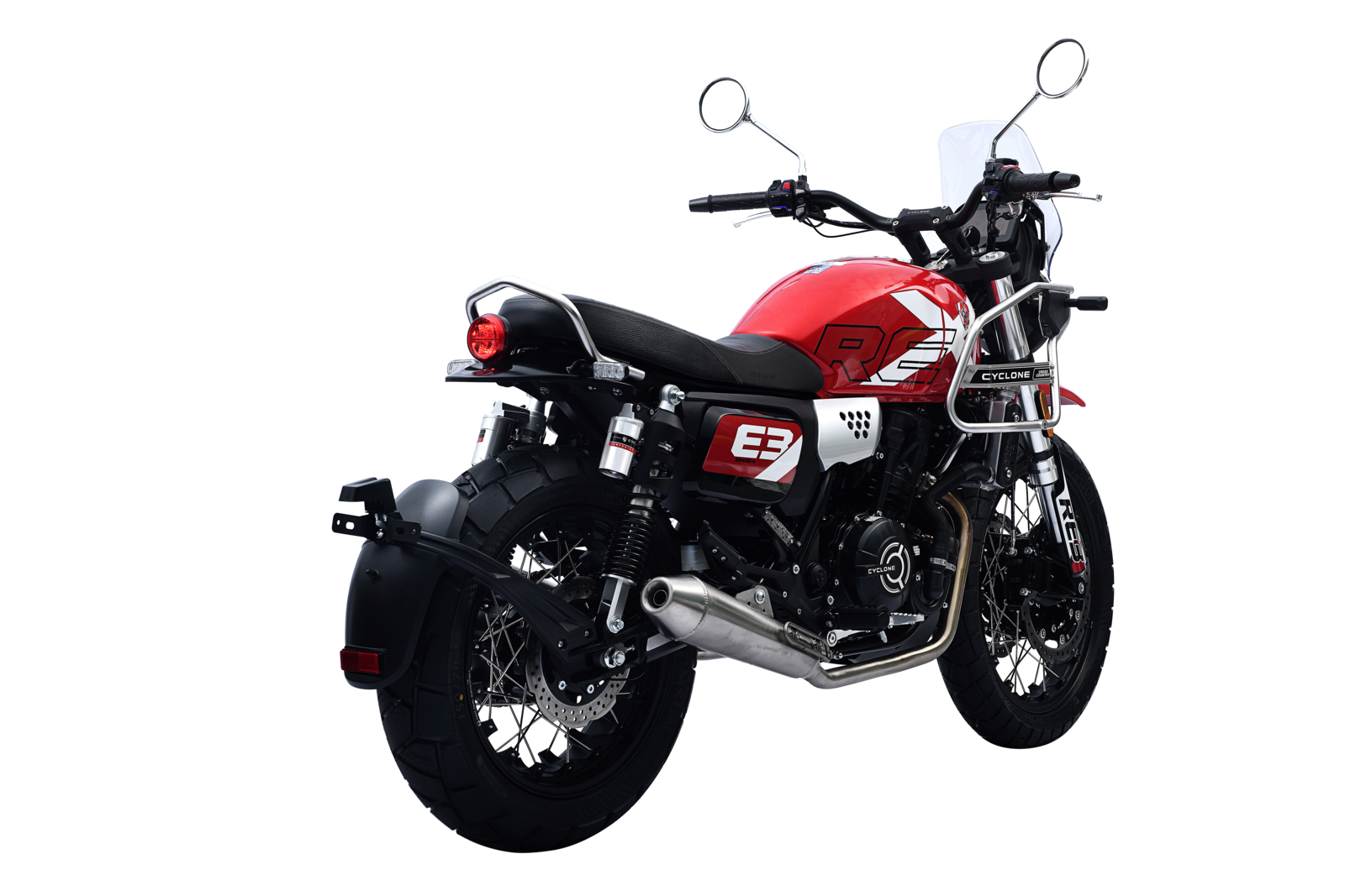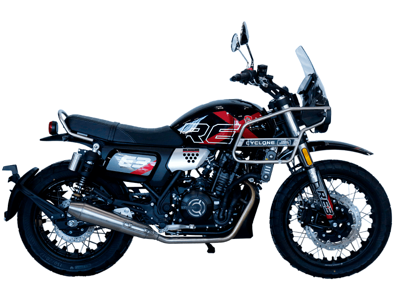 CYCLONE RE3 Scrambler (SR400-A) – универсальный мотоцикл, объединяющий в себе черты городского мотоцикла и эндуро. Управляя им, можно бросить вызов и городским пробкам, и скоростным автострадам, и всевозможному лёгкому бездорожью. Его дизайн отдаёт дань уважения каферейсерской тематике.