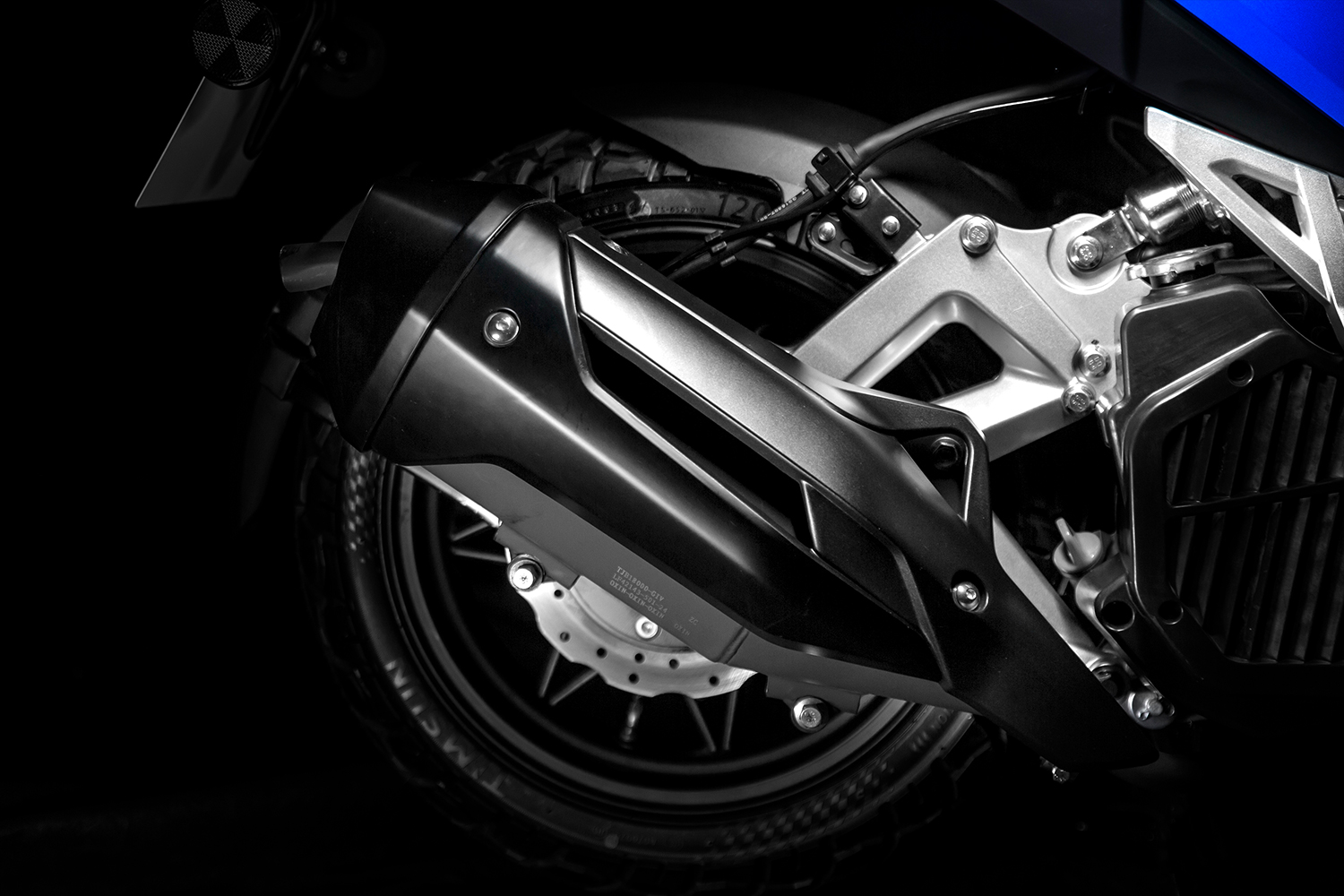 Установленный снизу двигатель характеризуется низким уровнем шума и вибраций во время езды. Оптимизированные фазы газораспределения позволяют достичь эффективного заполнения цилиндра и получить большой крутящий момент и достичь высокой мощности. Датчик положения боковой подставки: при опускании боковой подставки отключится все питание для обеспечения безопасности.